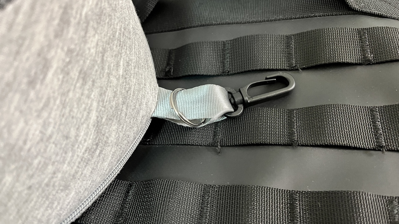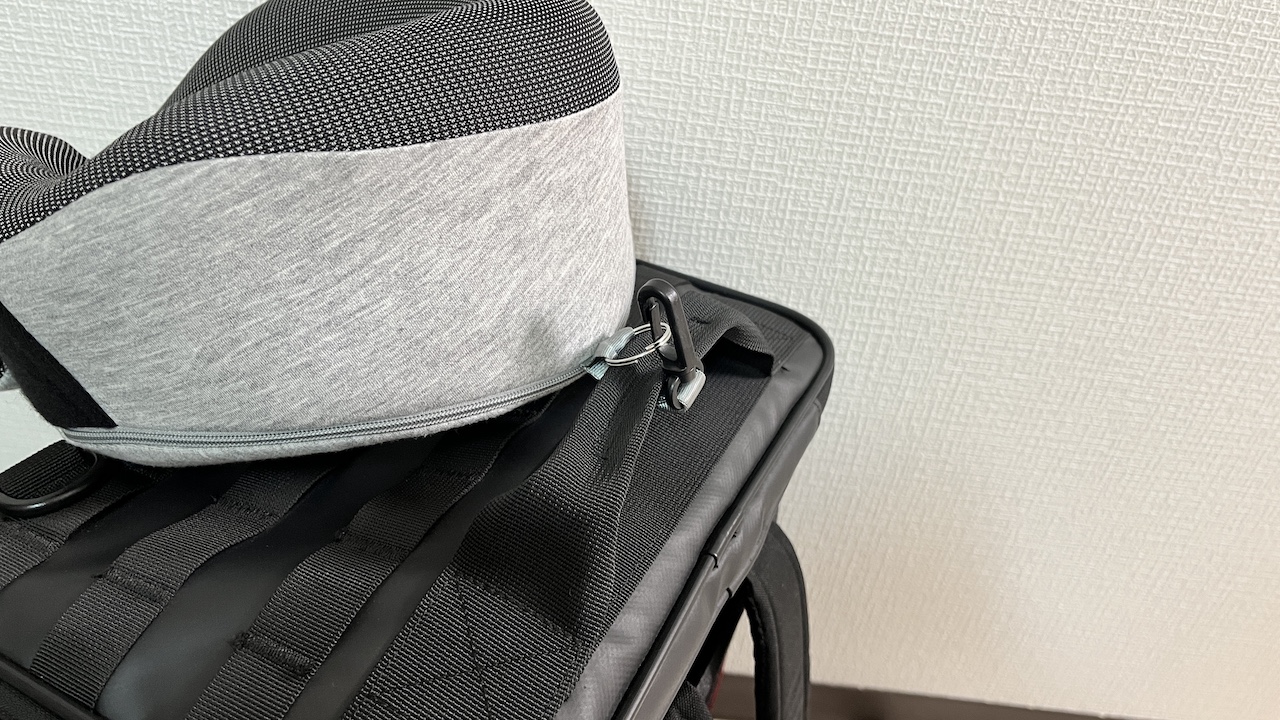 フックとリングを使ってかばんにネックピローを取り付けた様子