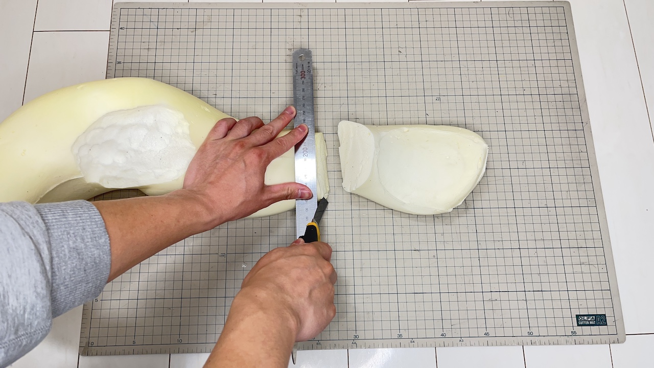 首の後ろに当たる部分は座席のヘッドレストで頭が前に押し出されないように削ります。