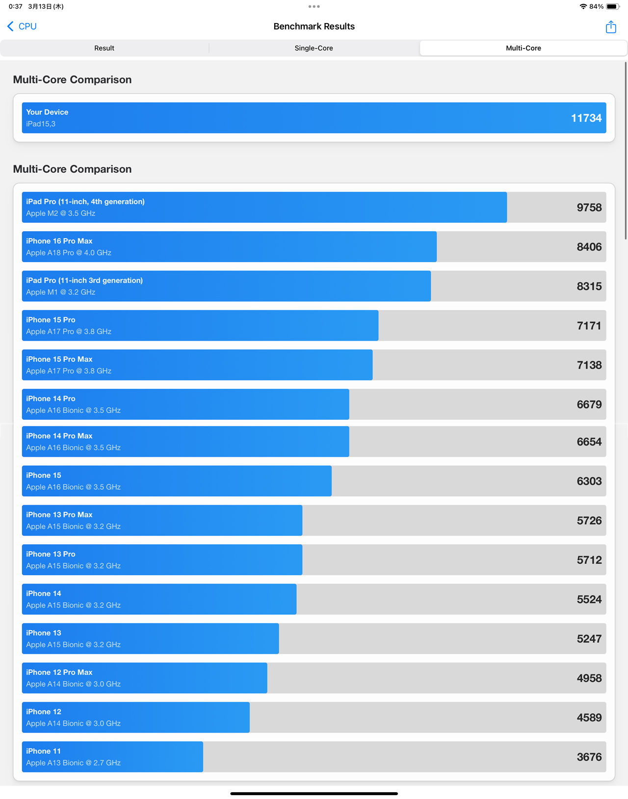 ランキング内にiPad Pro (M4)がいないのでググってみるとSingle Coreスコアが「3676」、Multi Coreスコアが「13388」でした。