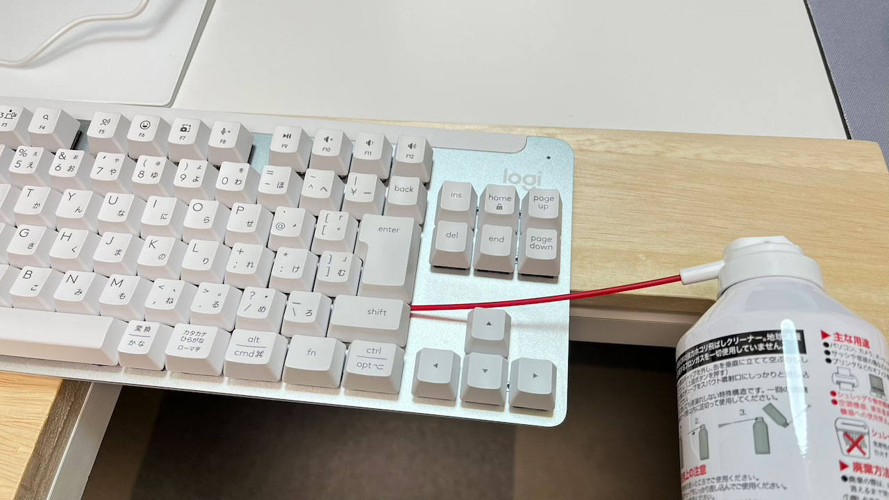 天板の上にキーを配置したフローティング構造のため、横からキーキャップの下にエアダスターのノズルを差し込めます。