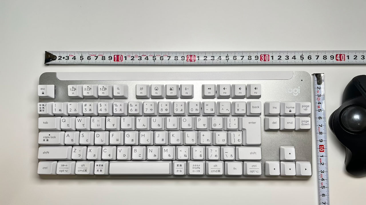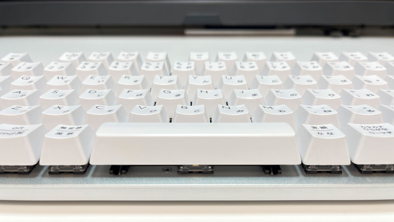 キーピッチや配置はフルサイズと同等で、ノートPCなどのコンパクト配列に慣れている人はゆとりを感じるかもしれません。