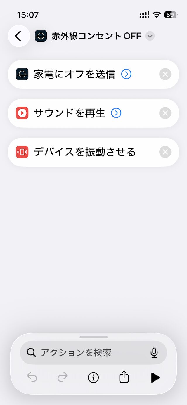 たー坊は通知の表示だけじゃ気付かないこともあるので、赤外線コンセントOFFのショートカットに「サウンドを再生」と「デバイスを振動させる」も追加で入れました。