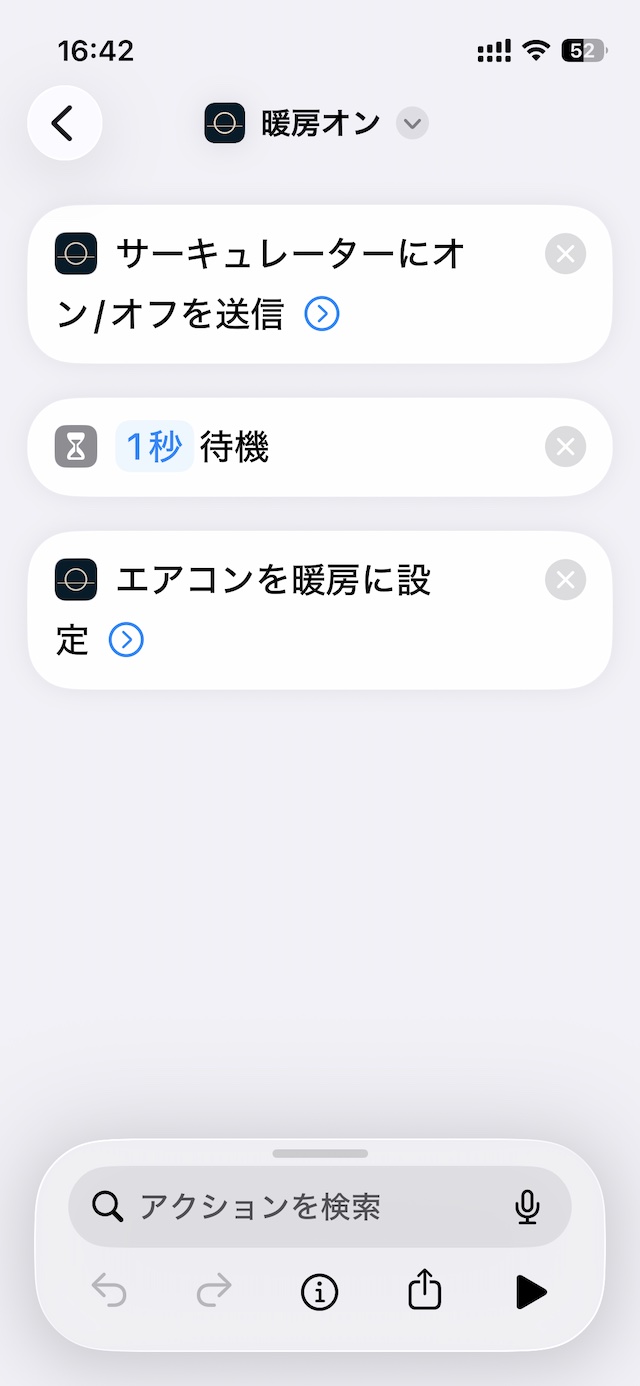 残念ながらサーキュレーターはオン/オフ共通の赤外線信号なので、暖房オン(またはオフ)のショートカットを2回連続タップしてしまうとエアコンの運転とチグハグになってしまいます。そう考えるとSwitch Botで揃える方がいいですね。