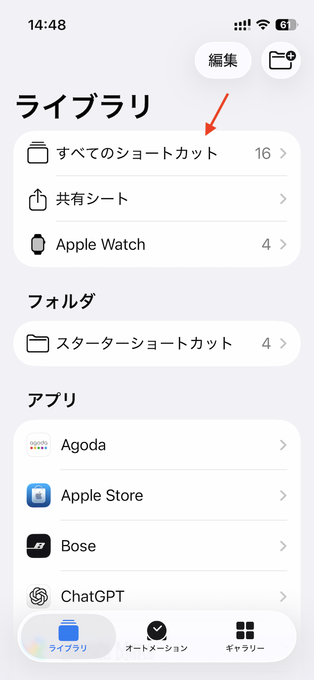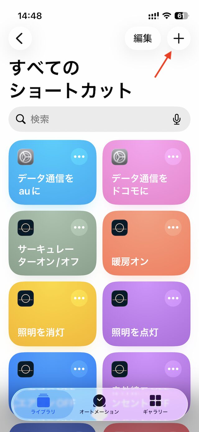 ショートカットアプリ内で「すべてのショートカット」→「右上の+ボタン」から。