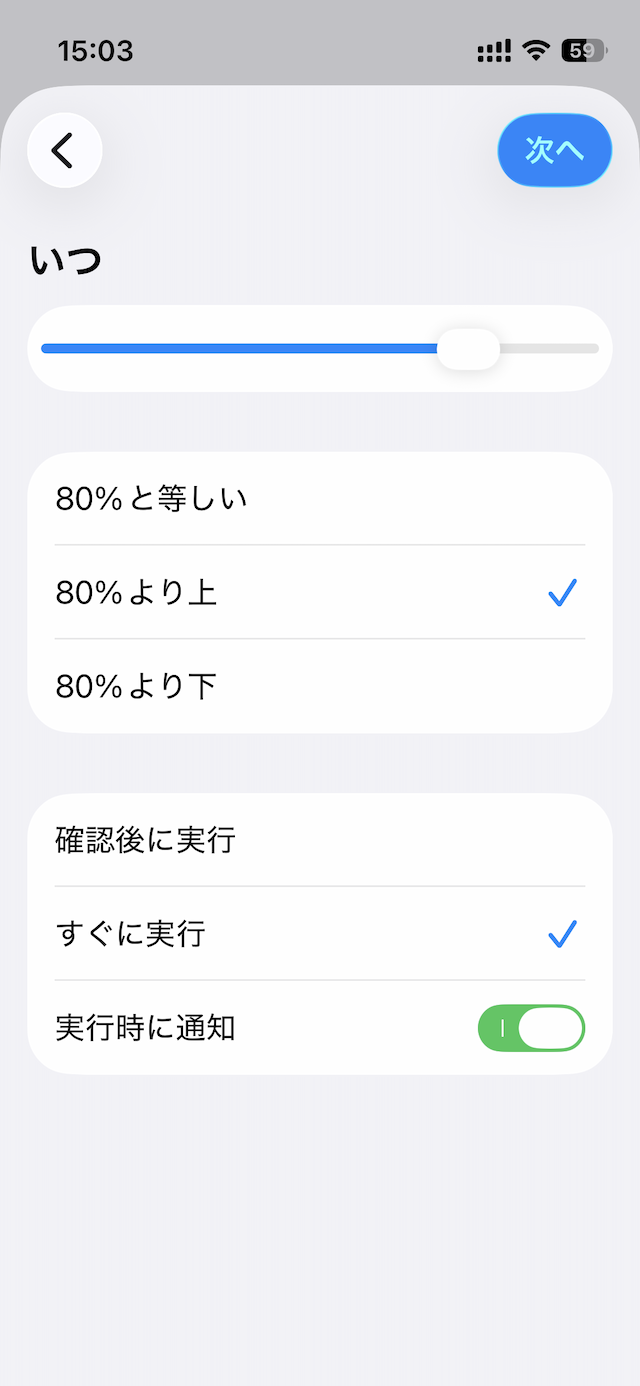 「いつ」の下のバーを動かしてパーセントを80%にし、「80%より上」、「すぐに実行」を選択します。
