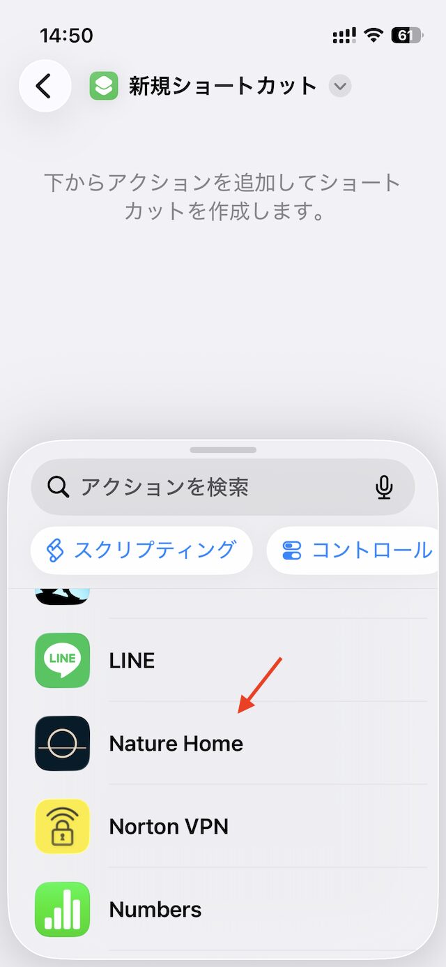 +ボタンを押したらNature Homeアプリを探します。ABC順なのでNのところにあります。