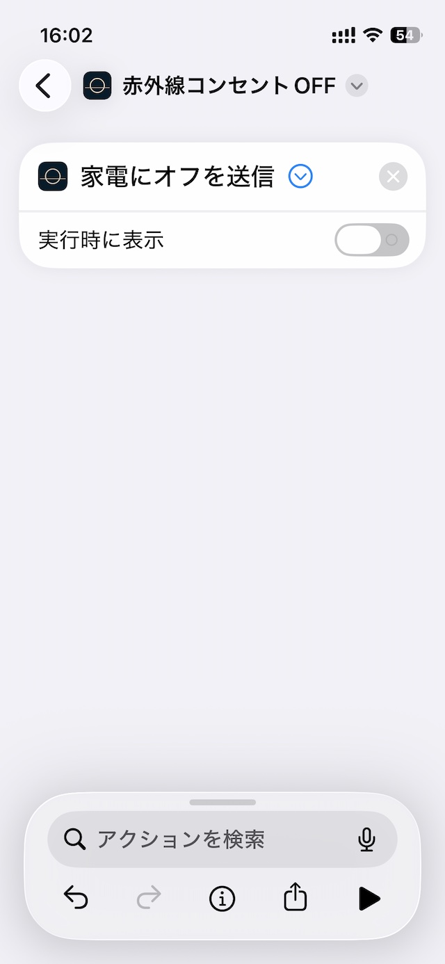 次にiPhoneのショートカットアプリにリモコンコンセントのオフを登録します。